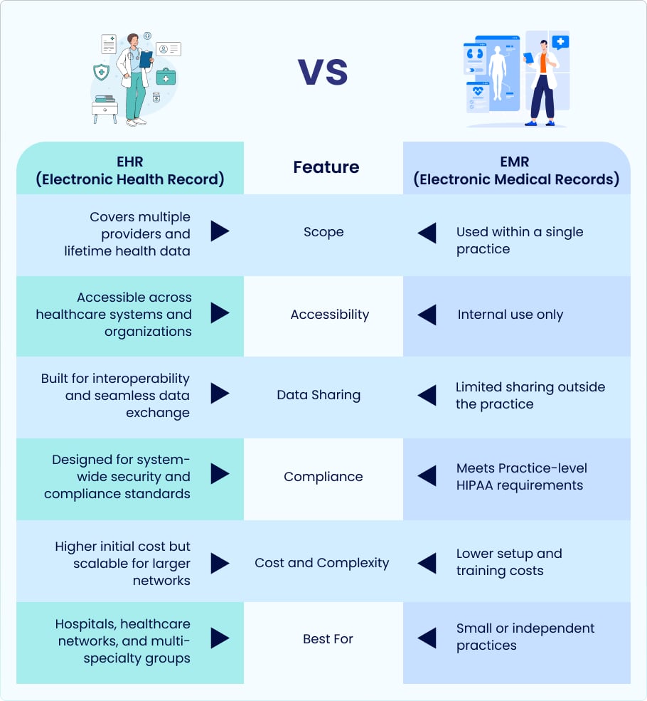 Choosing the right digital record system directly impacts productivity, patient experience, and long-term growth. The choice between an EHR and an EMR is more than a technical decision — it depends on your practice’s structure, interoperability goals, and future scalability.
